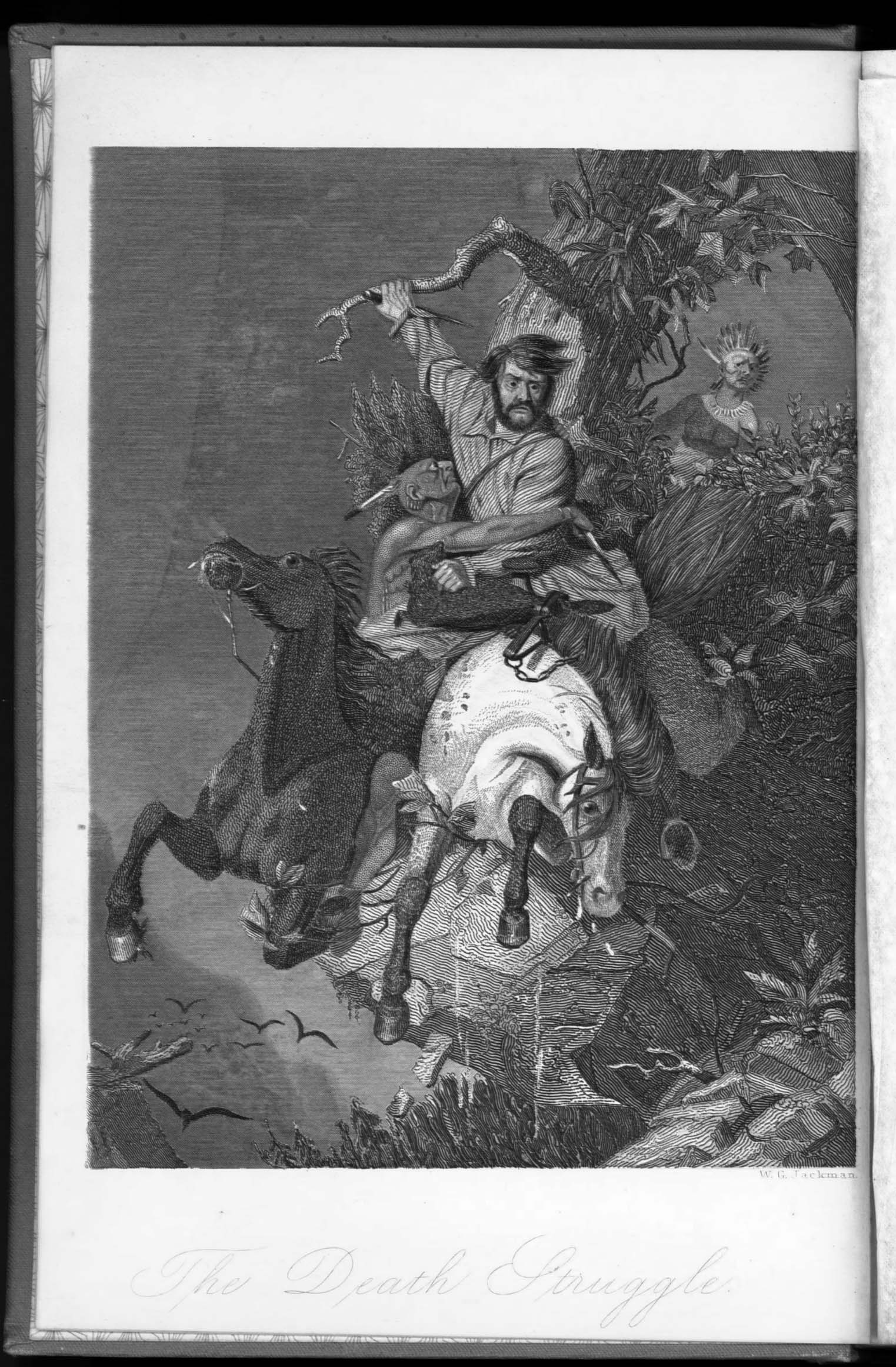Frontispiece drawing is by W.B. Jackman, full page protected with light paper, "The Death Struggle" showing horseback knife fight between Indian and settler, with another Indian looking on through some foliage. Author provides a preface, and there are 61 adventures listed in the "Contents and Illustrations" including "Adventures of Daniel Boone, "David Crockett's Fight with a Bear", "The Swamp Robbers of Louisiana", "Thrilling Escape from a Prison Ship".