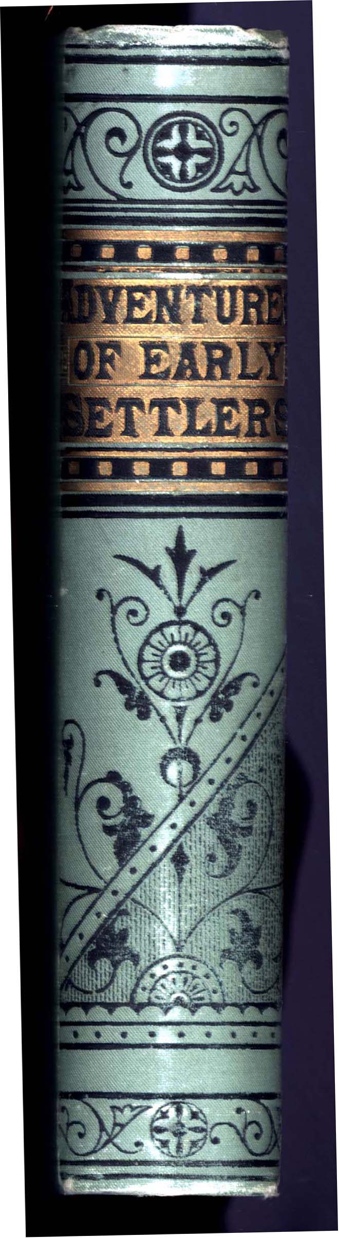 This is a first edition from 1861, published by John E. Potter & Co. of Philadelphia. Illustrated by 200 engravings. Cover is green cloth with black embossed drawings and somewhat dulled gilt background behind abbreviated title "EARLY SETTLERS". Spine also carries embossed decoration with "ADVENTURES OF EARLY SETTLERS." over gilt background.