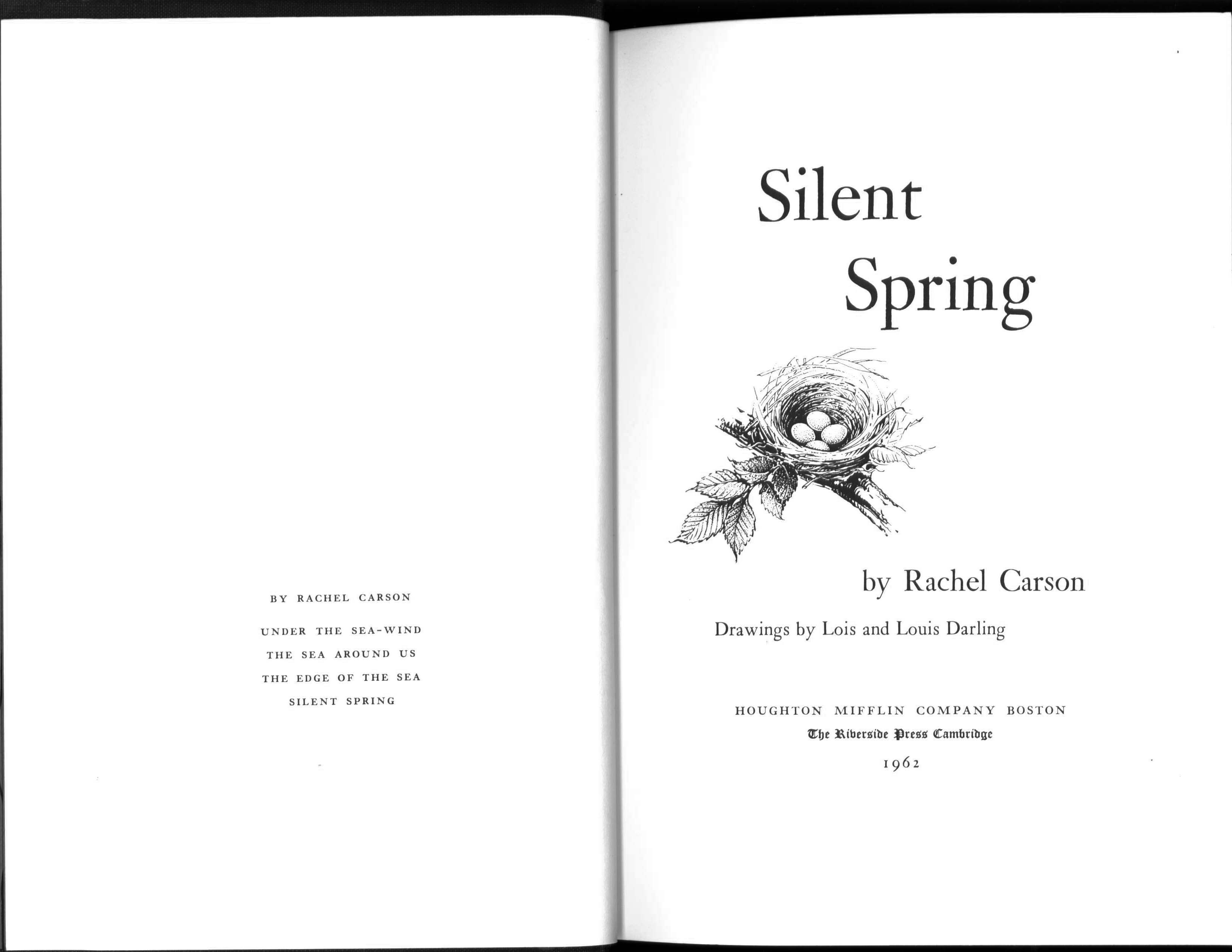 RC SILENT SPRING. by Rachel Carson, with drawings by Lois and Louis Darling. 1962 first printing of first editon of monumental work on environmental concern, backed by citations of sources listed from page 301 to 355, Carson also authored Under the Sea-wind, The Sea Around Us, and The Edge of the Sea. She is one of the most important environmental writers of our time, and she and her Silent Spring are given much of the credit for initiating the so-called environmental movement (Paul Brooks in Audubon, January 1987). Thus it is now also an important historical work. The book was attacked by the chemical industry, to the point where President Kennedy set up a panel of his Science Advisory Committee and its report completely vindicated her thesis (Brooks again).