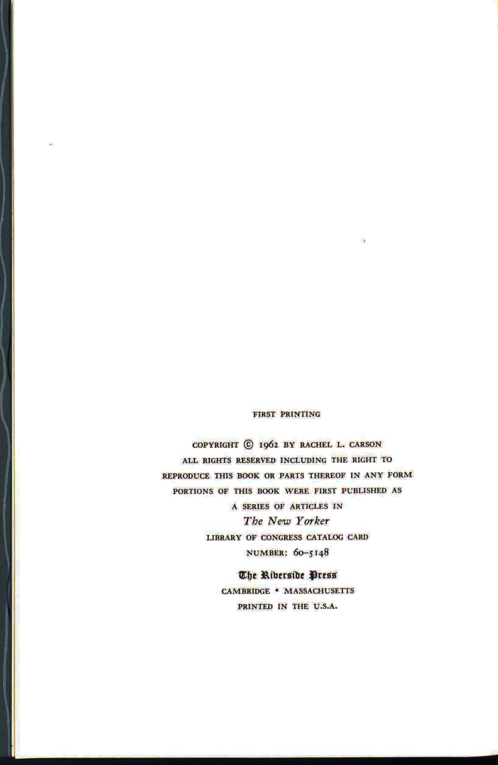 The first edition of Silent Spring was published in 1962 by Houghton Mifflin Co. The book has a green dust jacket with a $5.00 price stamp, green boards, and 'First Printing' on the copyright page. A Book of the Month Club issued in 1962 looks similar but does not have printings on the copyright page, and the dust jacket bears Book of the Month Club instead of price point." [This copy has "First printing" on the copyright page.] Thus this copy is not a Book of the Month Club issuance. It is also not ex-library.