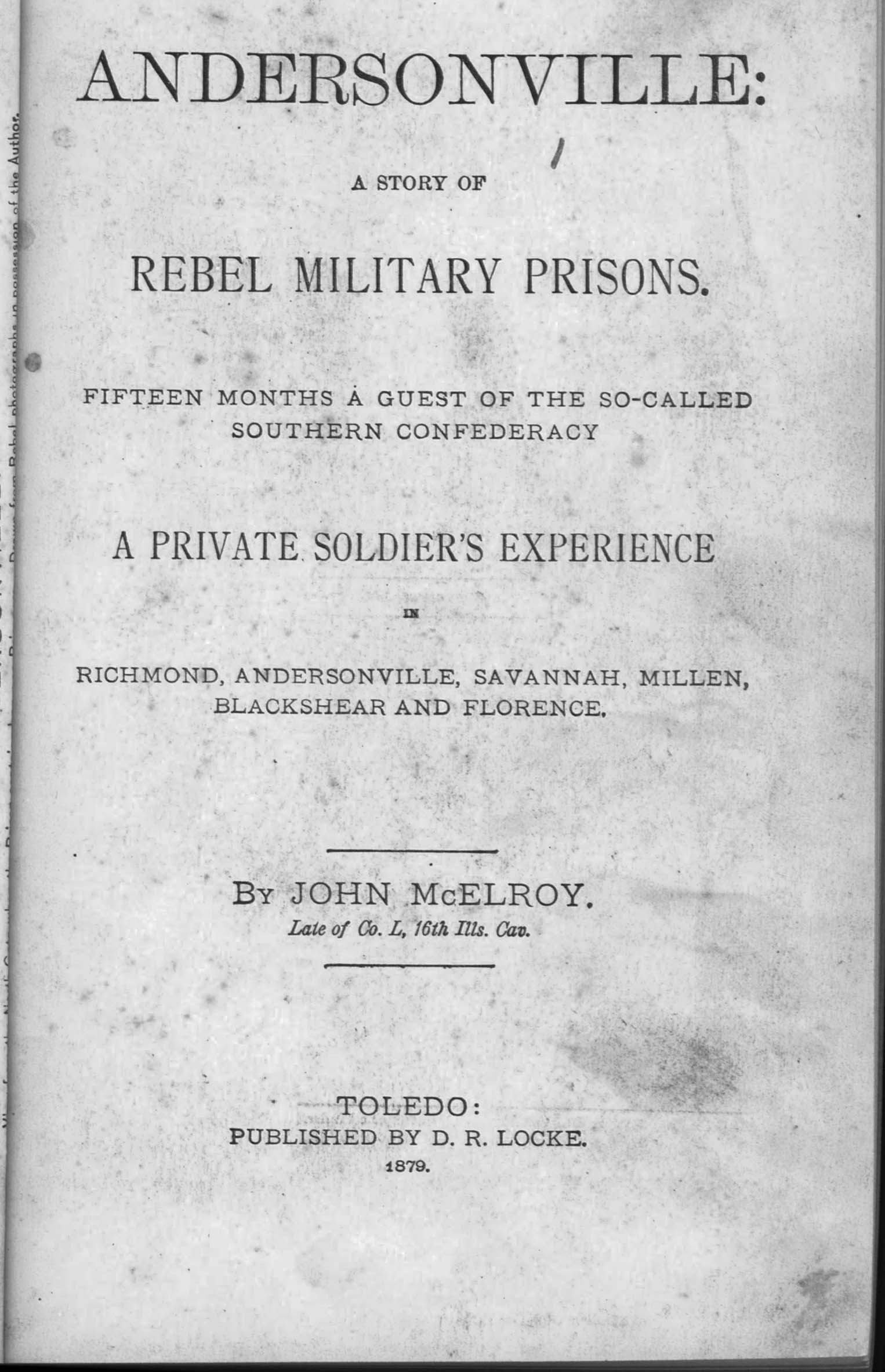 RCANDERSONVILLE: a story of rebel military prisons. by John McElroy, Late of Col. L 16th Ills. Cav. 1879 first edition, red cover. Published by D.R. Locke, Toledo. From title page: "Fifteen months a guest of the so-called Southern Confederacy. A private soldier's experience in Richmond, Andersonville, Savannah, Millen, Blackshear, and Florence. The Andersonville prison for Federal soldiers was notorious for its harsh conditions; of 45,000 prisoners (4 times its capacity and a population greater than that of many U.S. cities at that time), nearly 13,000 died. There was little food, not much shelter, and poor water. The prison was established near the end of the Civil War and lasted less than 2 years, its warden being hanged for his offenses in 1865. The account details the grim life of the captives; their sometimes brutal, even fatal, treatment by their captors; their longing for escape and attempts to get out; and their failures. Included also are accounts of other rebel prisons. There are 655 +xxx pages, 154 illustrations (listed by page number) of prison features and conditions, inmates, and their captors. One shows an overview of the stockade interior. Size is 6 in. x 9 in. and 2 in. thick. The narrative is divided into 83 chapters as an important work of American history--or of any analysis of incarceration. The prison site is now included in the Andersonville National Historic Site, administered by the National Park Service as is the nearby Andersonville National Cemetery where many of the former inmates are interred.